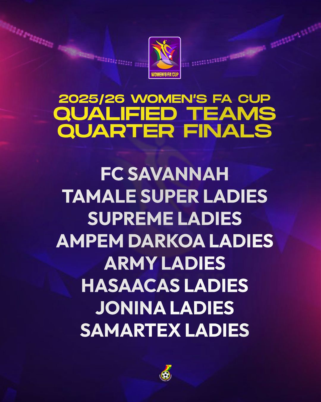 The qualified sides are FC Savannah, Tamale Super Ladies, Supreme Ladies, Ampem Darkoa Ladies, Army Ladies, Hasaacas Ladies, Jonina Ladies, and Samartex Ladies.
