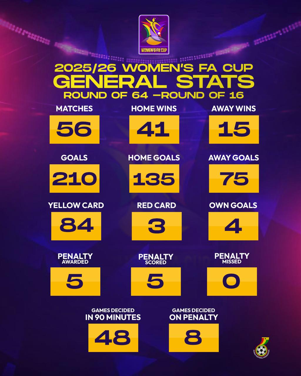 The 2025/26 Women’s FA Cup has reached an exciting stage, with 56 matches played from the Round of 64 through to the Round of 16. So far, 41 home wins and 15 away wins have been recorded, producing a total of 210 goals 135 scored by home sides and 75 by away teams. Most games have been settled within regulation time, with 48 matches decided in 90 minutes, while 8 fixtures went to penalties. Discipline has been relatively low, with just 3 red cards and 84 yellow cards shown, alongside 4 own goals recorded – giving us a competitive and entertaining cup campaign so far.